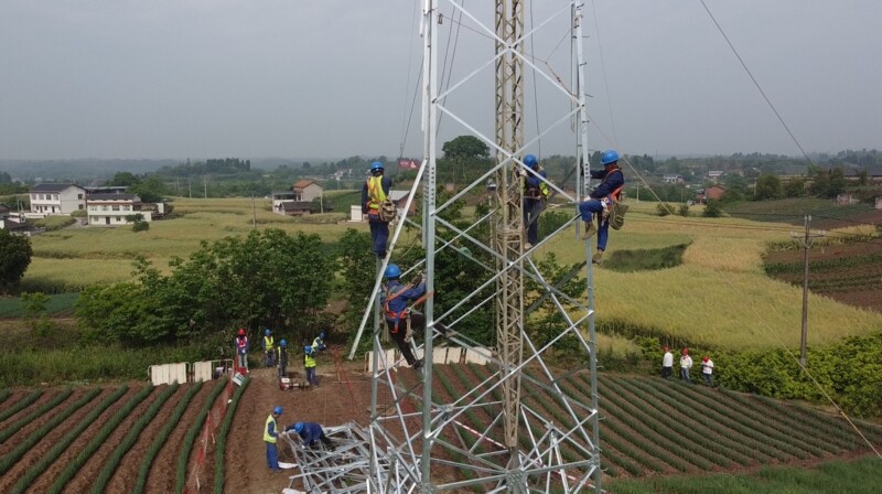 近日,记者在威远县界牌镇35千伏线路新建工程组塔现场看到,电力施工人员正加快进行组塔作业,高达30米的输电铁塔在附着式抱杆与电动绞磨的协同作业下节节攀升,地面组装、构件吊装、螺栓紧固等工序环环相扣,现场工作忙而有序,安全可控,铁塔组立如火如荼。