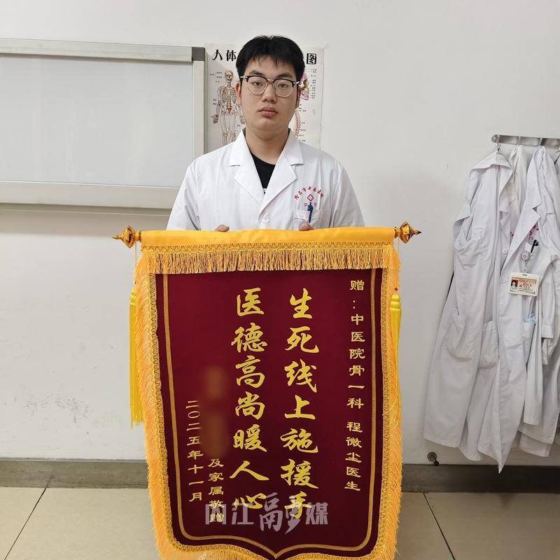 “程同学,这面锦旗您一定要收下,是我们全家的心意啊!”近日,在隆昌市中医医院,一位逝者家属捧着一面鲜红的锦旗,执意要送给该院实习生程微尘(内江医科学校2023级中医康复技术3班学生)。红底烫金的锦旗上,“生死线上施援手,医德高尚暖人心”14个字,在阳光下格外亮眼。