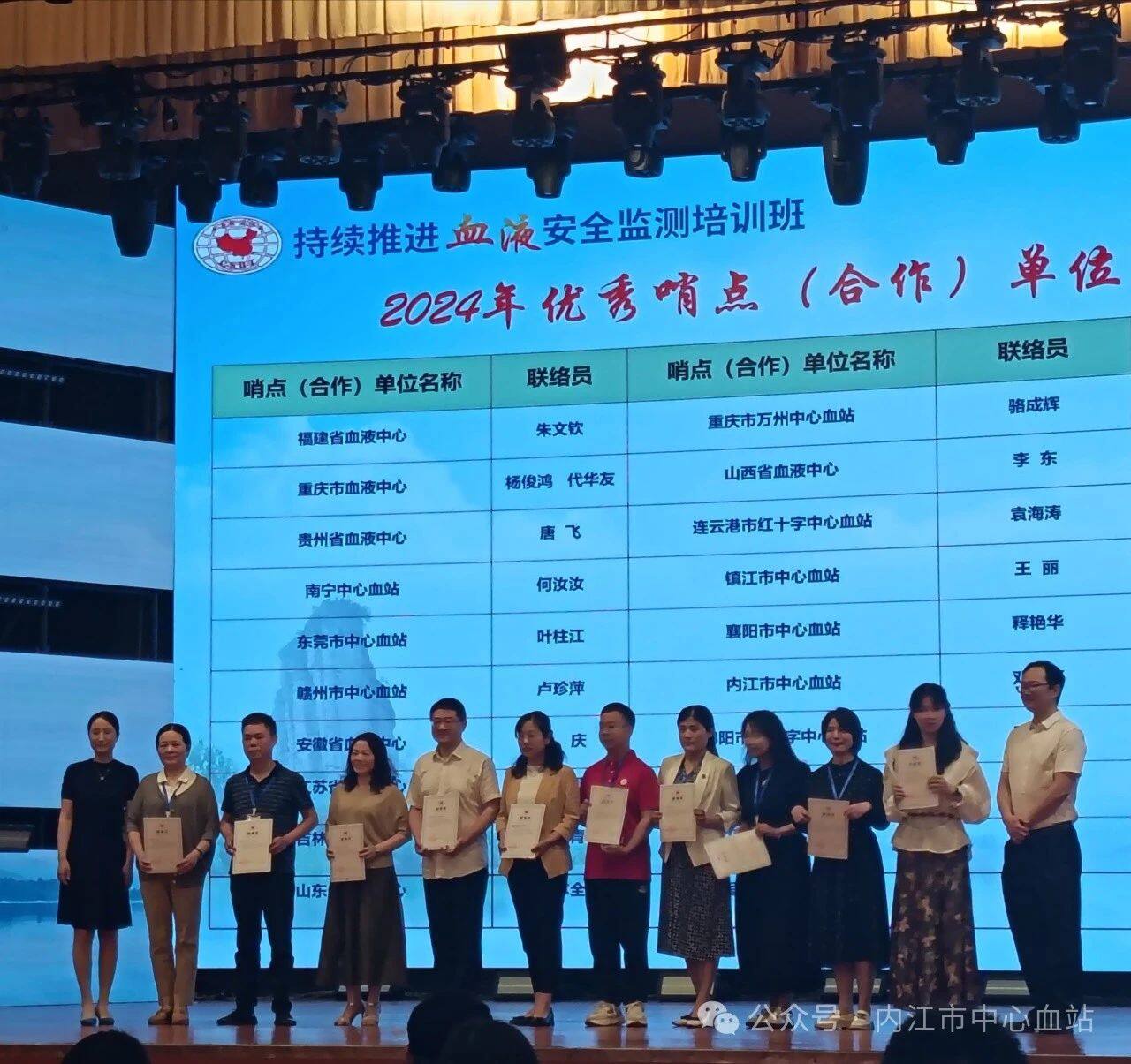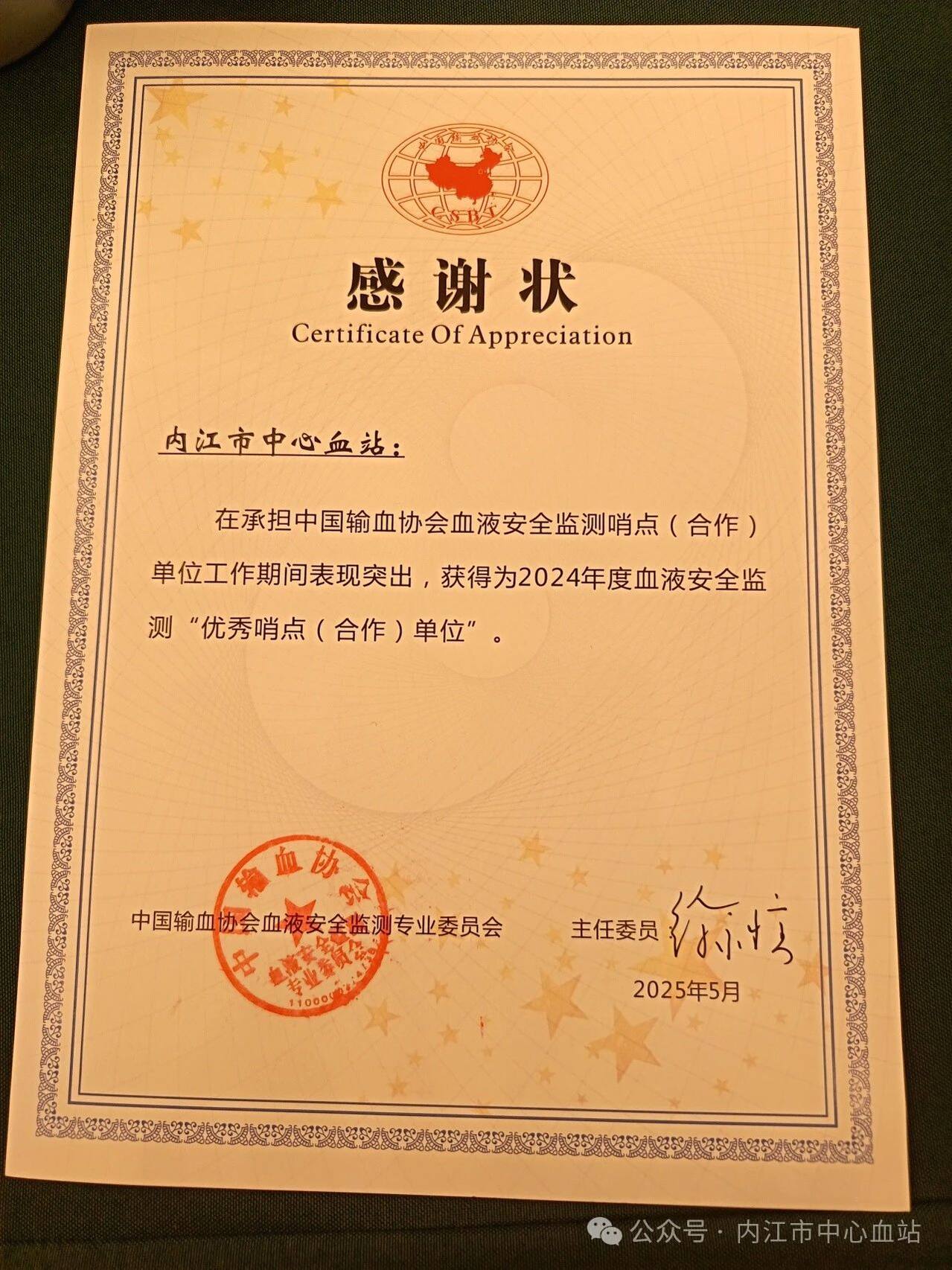 2025年5月7日,在中国输血协会血液安全监测专业委员会举办的持续推进血液安全监测培训班上,内江市中心血站被授予2024年度血液安全监测“优秀哨点(合作)单位”。为血液安全监测大数据体系提供数据支撑,经过整合分析和纠正预防对整条输血链进行有效监测,最大限度提高血液供应的安全性和有效性。